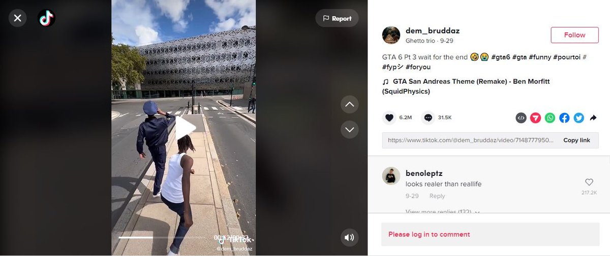 From TikToks of in-game successes (and failures) to live Twitch streams, social media and videogames are perfectly matched. Modern consoles often have in-built features that let users easily record their play to share online, but this video isn’t that. It looks like leaked footage of Grand Theft Auto 6’s new graphics, but it’s a real-world video mimicking the series’ old-school movements, gestures and streetscapes. It’s like digital cosplay and reflects a larger trend of social users recreating game worlds in real life – like giving strangers side quests as if in GTA (embedded below) – which highlights the blurring of online and offline life. It’s been viewed over 40m times, but there are many versions out there. This TikTok from user @bryteosky features dialogue, sound effects, cinematic cut scenes, graphic overlays and an impressively large cast to further anchor reality to the game.