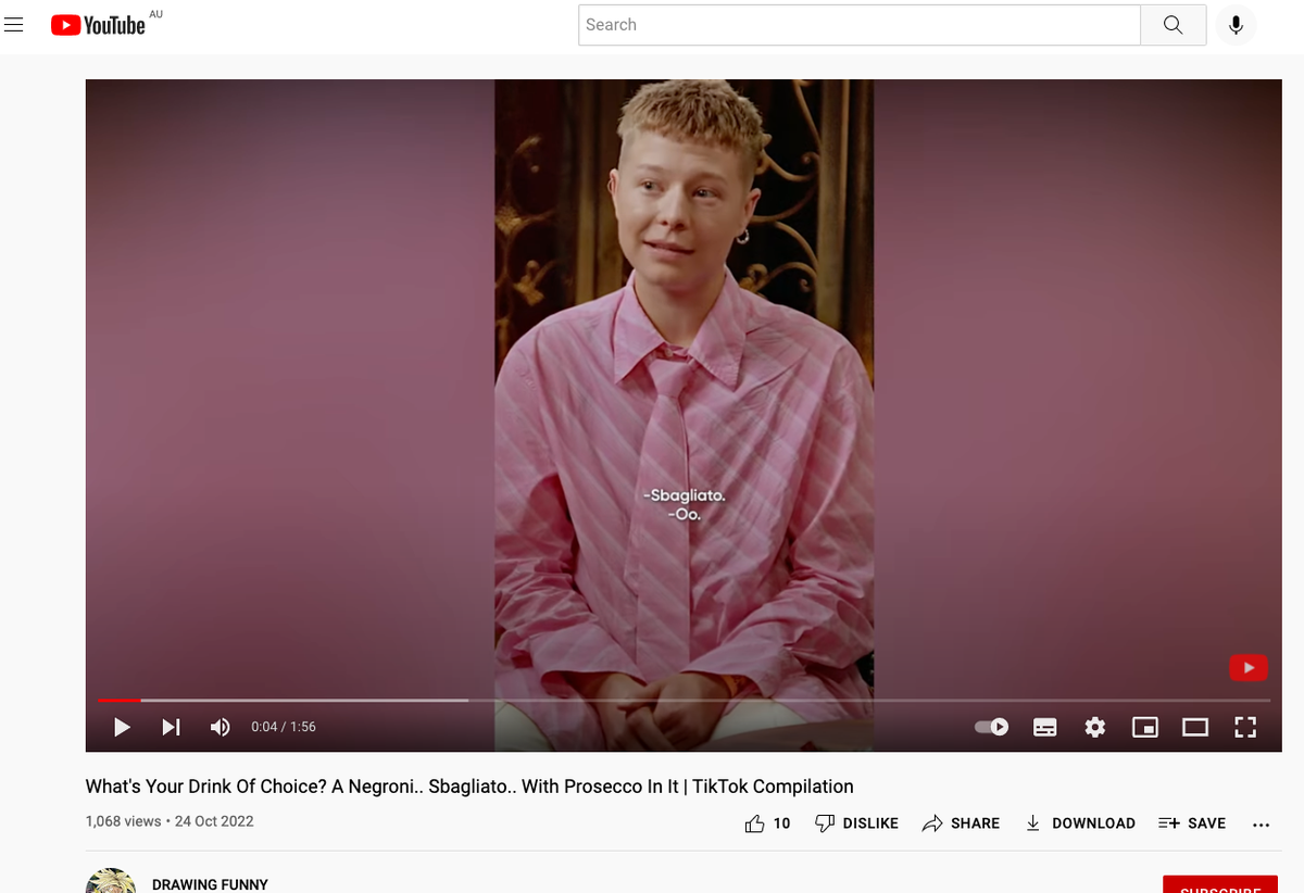 Digital screen recording of Drawing Funny's YouTube post "What's Your Favourite Drink? A Negroni.. Sbagliato.. With Prosecco In It"