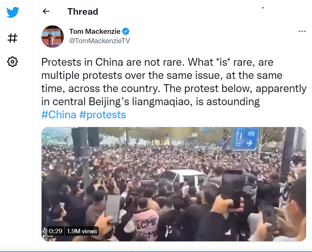 As the Wall Street Journal writes, “Twitter Becomes Stage for China Protests Despite Ban by Beijing”, with protestors using Virtual Private Networks (VPNs) to post their videos, as well as reacting quickly before the government’s censorship algorithms catch up. Footage seen in recent days include protestors fighting with authorities in high-rise stairways (embedded below) and medical authorities patrolling daily Covid tests with machine guns. However, without the usual verification methods used by traditional media outlets, it’s hard to be certain of the authenticity of videos. Meanwhile, anti-lockdown activists in other countries have been quick to point out that many countries suppressed anti-lockdown protests.