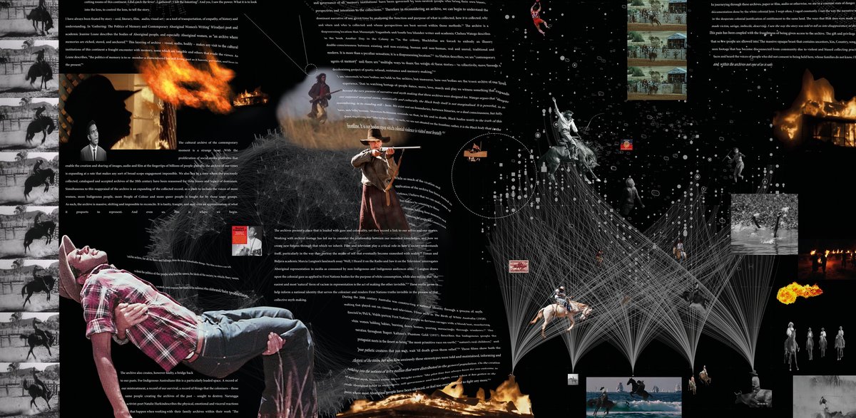 Jazz reclaims these images, combining them with stills from film and TV, including The Phantom Stockman (1953), Radiance (1998) and The Drover’s Wife (2021), in this large-scale photographic essay. It celebrates First Peoples representation and the Aboriginal scholars who critique this colonial hoarding, giving new meaning to images that have been dislocated by archival practices. Jazz asks, “If these archival collections are the rodeo, who is playing cowboy with our images?”
