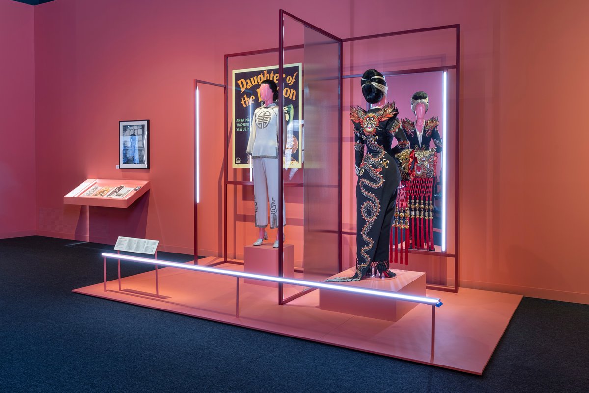 In Limehouse Blues (1934), Wong plays Tu Tuan. Costume designer Travis Banton signified Tuan’s villainous nature by snaking a dragon motif down her body, which you can see in the black-and-white image in the display in Goddess. On the lounge suit featured in the video below, he beaded another Chinese emblem into the silk to underline the link between Asian characters and villains.