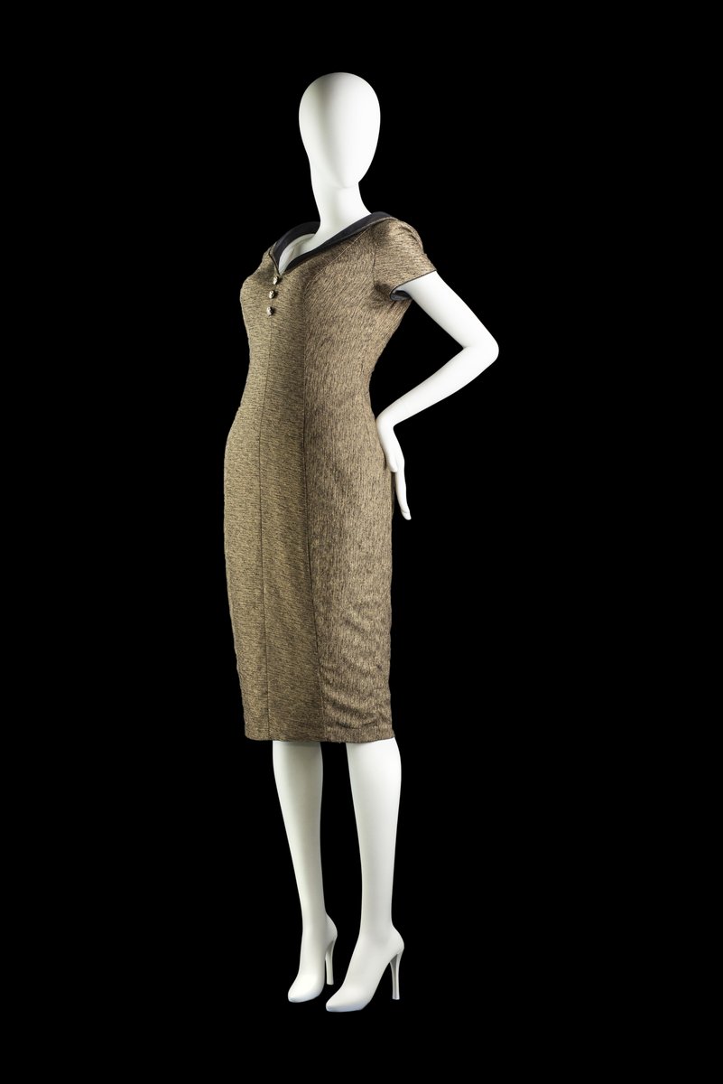 Designer Margot Wilson was solely responsible for creating Tilly’s (Kate Winslet) wardrobe, and they collaborated closely to get the best fit and style. This dress is perfectly tailored to Winslet’s form. It showcases the meticulous craftsmanship needed to make the highly structured and figure-defining designs of early 1950s European couture.
