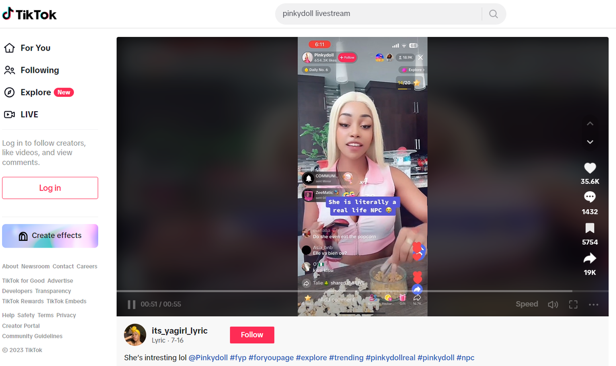 Spike Jonze’s Her has nothing on the latest Tiktok trend: NPC livestreaming. Developed by Canadian streamer Fedha Sinon, AKA Pinkydoll, streamers imitate the hyperreal behaviour of a videogame background character. In this video, Pinkydoll performs with a mechanical consistency to her movements and voice as she repeats catchphrases in response to viewer donations. As gifts pour in, she delivers responses in rapid-fire, perfectly imitating the uncanny valley effect of a computer-generated interaction. Most uncanny of all is her ability to maintain the persona for hours at a time, allegedly earning her $2-4000 per livestream.