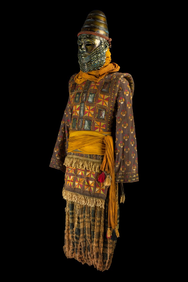 Cotton fabric, embroidered and padded, with applied leather decoration and painted polyurethane fabric-lined helmet with face mask