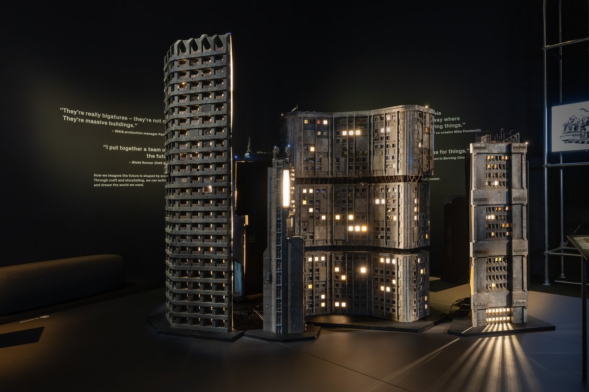 Wētā Workshop built the detailed ‘bigature’ sets to create the futuristic Los Angeles. Cinematographer Alex Funke filmed these scaled sets, capturing the look of real surfaces and lighting. Each of the 38 models took about a week to construct, paint and weather. Art director Steven Saunders described these miniatures as “a composition of tiny vignettes” that form a rich visual world. According to Funke, this world shows that “technology and commerce have moved on, but everybody else has been left behind.”