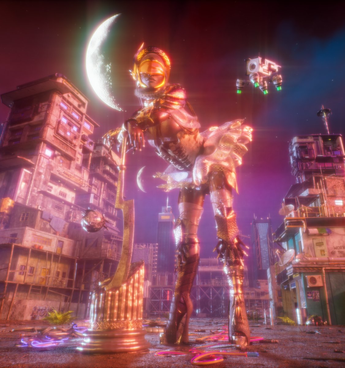 To create The Darkness Between the Stars Attafuah has continued to master cutting-edge digital techniques, including VFX, animation, 3D modelling, and character design to craft her speculative world in Unreal Engine. She sculpted digital characters, designed vast landscapes, and employed rigging and simulation techniques, creating a vibrant aesthetic reminiscent of GIFs and cinemagraphs. No part of the work was made using generative AI. Attafuah also created the original soundscape.