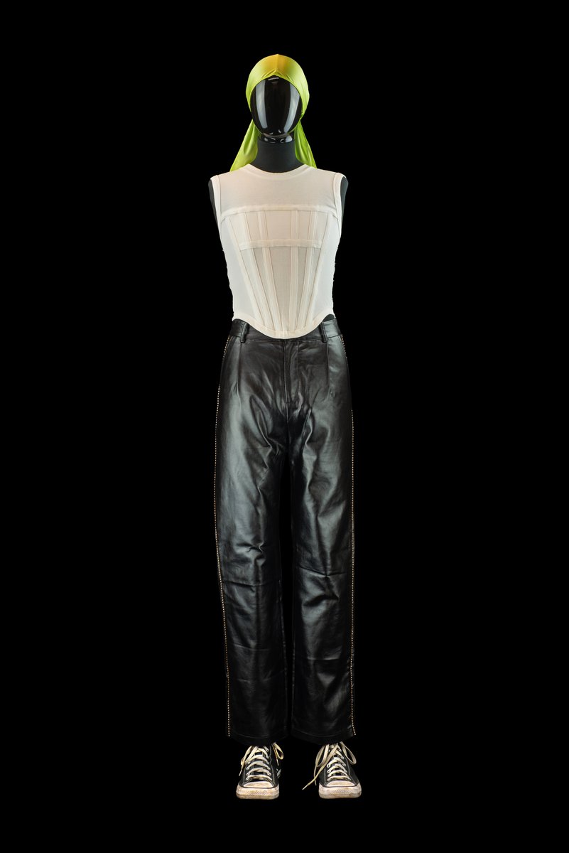 Quinni (Chloé Hayden) is a character on the autism spectrum. She wears noise-cancelling headphones to help with sensory overload, and her love of colourful outfits, chunky rings and creative makeup is a way of showing how she feels. Actor and autism advocate Hayden worked closely with costume designer Rita Carmody to make sure Quinni’s look felt true – both protective and full of personality.