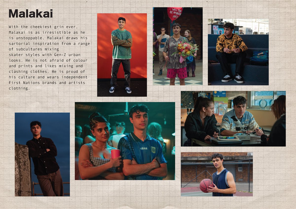 Malakai Mitchell (Thomas Weatherall) brings his own energy to the screen. His look is easygoing but expressive, with sportswear, streetwear and cultural pride woven through his style.
