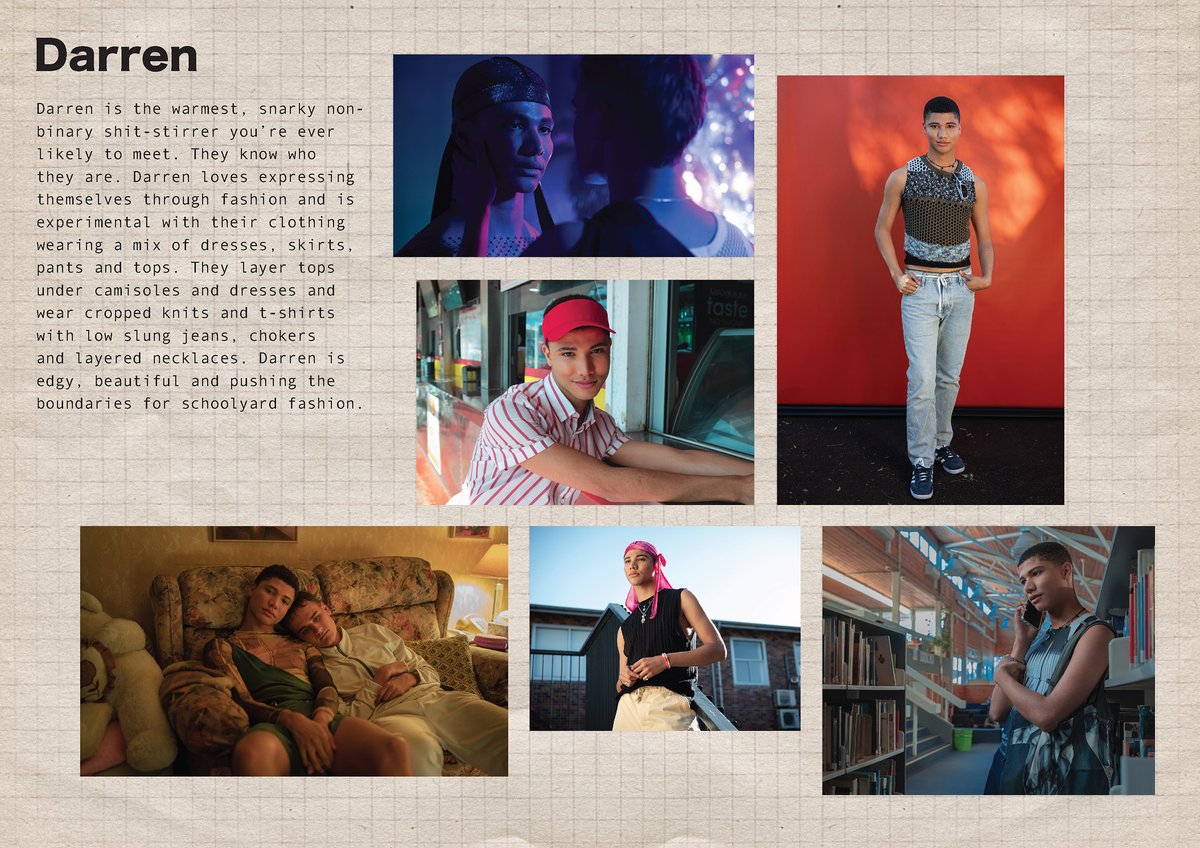 Darren (James Majoos) is openly queer and non-binary. Their bold, stylish wardrobe mixes traditionally “masculine” and “feminine” pieces to reflect a confident, playful identity. From glitter to sharp tailoring, Darren dresses to express – and impress – on their own terms.
