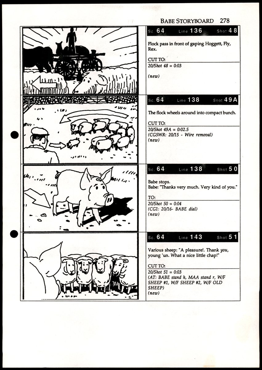 Bringing Babe to life was a feat of careful planning, storytelling and animal training. Every shot was pre-planned and storyboarded, with call sheets mapping out the complex coordination of human, animal and animatronic performers. You can see the storyboards in the case for the scene playing above.