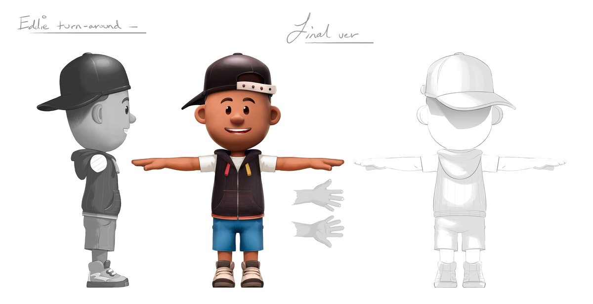 The animatic featured in the video is from “Episode 2: Rock Paper Scissors”, where Eddie helps his friend Tal win a game of ‘rock, paper, scissors’. Animatics are rough animated sequences created from storyboard images. They help animators and directors plan movement, timing and character interactions before final animation.