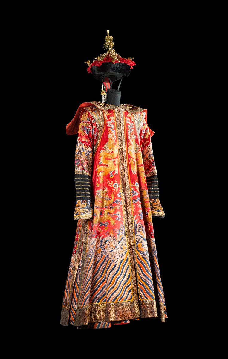 From seller: A Princess of the Blood gown and overrobe from the 1987 multi Oscar-winning historical drama The Last Emperor. These women can be seen on several occasions throughout the movie, when PuYi chooses his secondary consort, and at PuYi’s wedding to the Empress. This stunning and elaborate costume consists of a full-length gown of printed red rayon satin, overprinted with dragon robe motif, similarly printed sleeveless overrobe. Also included is a black satin headband with gold filigree buttons (some have been lost over the years) and a string of glass beads and polished stones that hang down the chest, and a cream quilted cotton under robe.