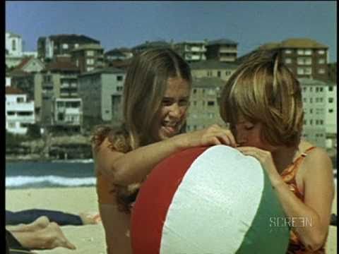 Scenes at Australian metropolitan beaches of crowds of people sunbathing, skylarking, swimming, and surfing. Without spoken commentary.