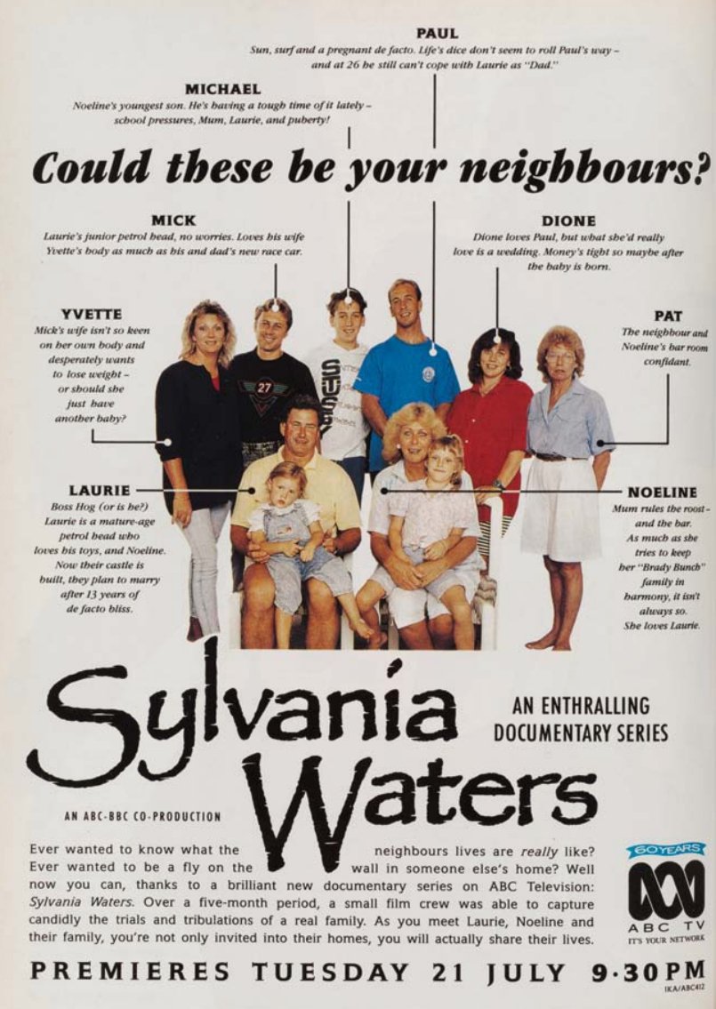 Sylvania Waters was an Australian reality television series that followed the lives of an Australian family – one of the first such programs in Australia. It premiered on Australian television in 1992 and was co-produced by the Australian Broadcasting Corporation and the British Broadcasting Corporation. The show documented the lives of Noeline Baker and Laurie Donaher of 48 Macintyre Crescent in the Sydney waterside suburb of Sylvania Waters over a six-month period, emphasising the couple’s newfound wealth and luxurious lifestyle as well as interpersonal conflicts.