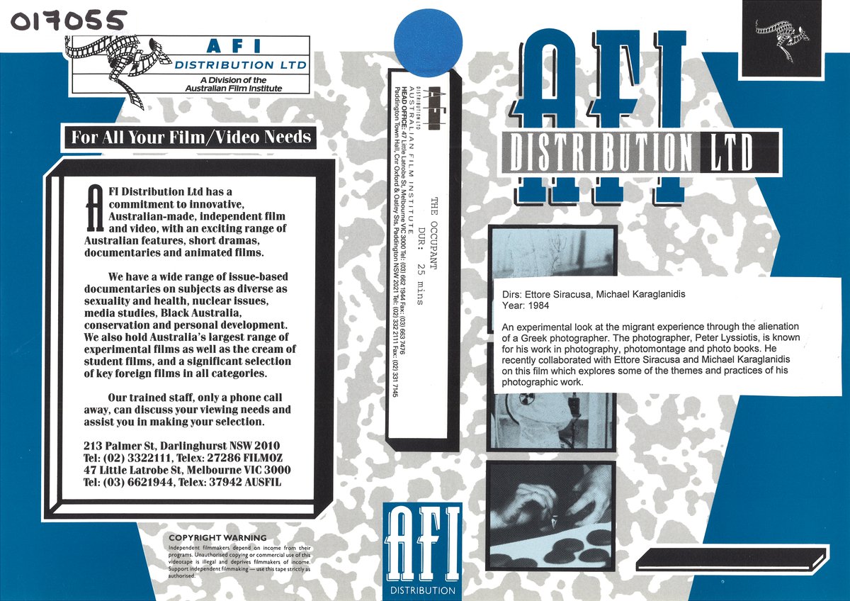 An experimental look at the migrant experience through the alienation of a Greek photographer. The photographer, Peter Lyssiotis, with memories of his homeland Cyprus, his relationship with his father and fantasies based in the photographer’s everyday life is well known for his work in photography, photomontage and photo books. He recently collaborated with Ettore Siracusa and Michael Karaglanidis on this film which explores some of the themes and practices of his photographic work.
