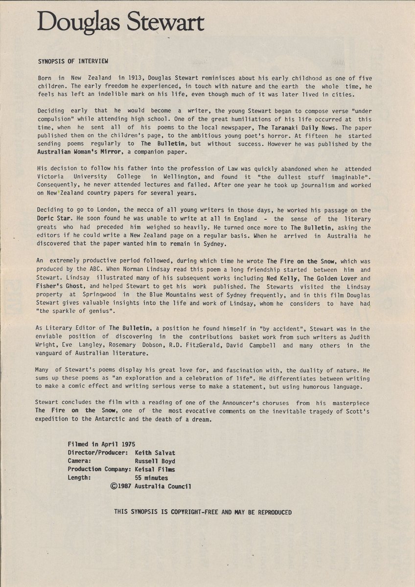 Playwright and poet, Douglas Stewart, was for many years the Literary Editor of the Bulletin, and friend of many writers and artists, including Norman Lindsay, Judith Wright and David Campbell.