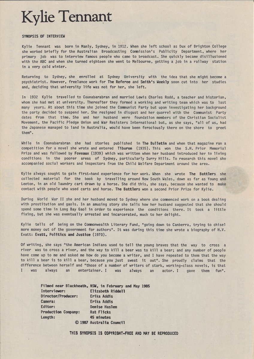 Kylie Tennant drew her inspiration from people she knew, and her exuberant interview is in itself a valuable piece of Australian social history.