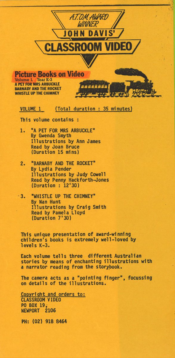 The award winning, Australian Children’s stories on this video include: “A Pet for Mrs Arbuckle” by Gwenda Smyth with illustrations by Ann James and narration by Joan Bruce. “Barnaby and the Rocket” by Lydia Cowell and narration by Penne Hackforth Jones. “Whistle Up the Chimney” by Nan Hunt with illustrations by Craig Smith and narration by Pamela Lloyd.