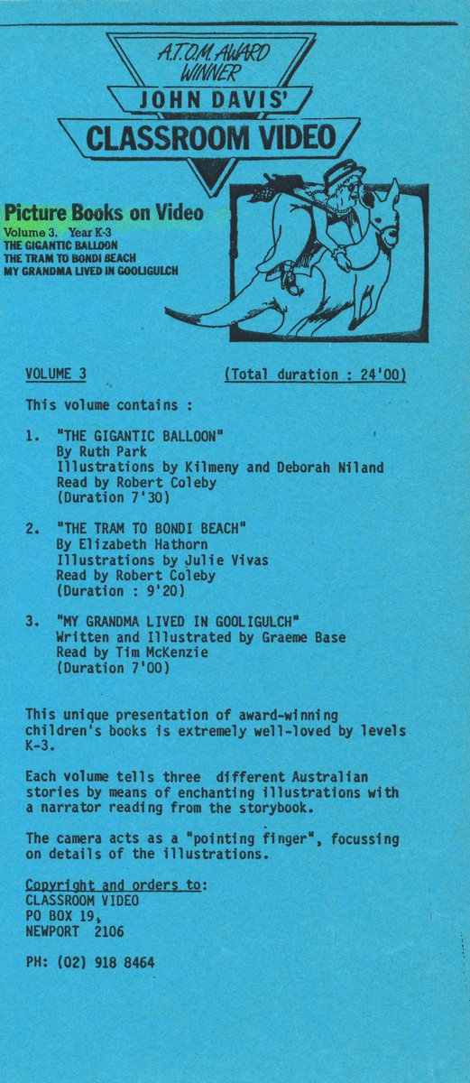 The award winning, Australian children’s stories on this video include “The Gigantic Balloon” by Ruth Park with illustrations by Kilmeny and Deborah Niland and narration by Robert Coleby, “The Tram to Bondi Beach” by Elizabeth Hathorn with illustrations by Julie Vivas and narration by Robert Coleby, and “My Grandmother Lived in Gooligulch” written and illustrated by Graeme Base with narration by Tim McKenzie.