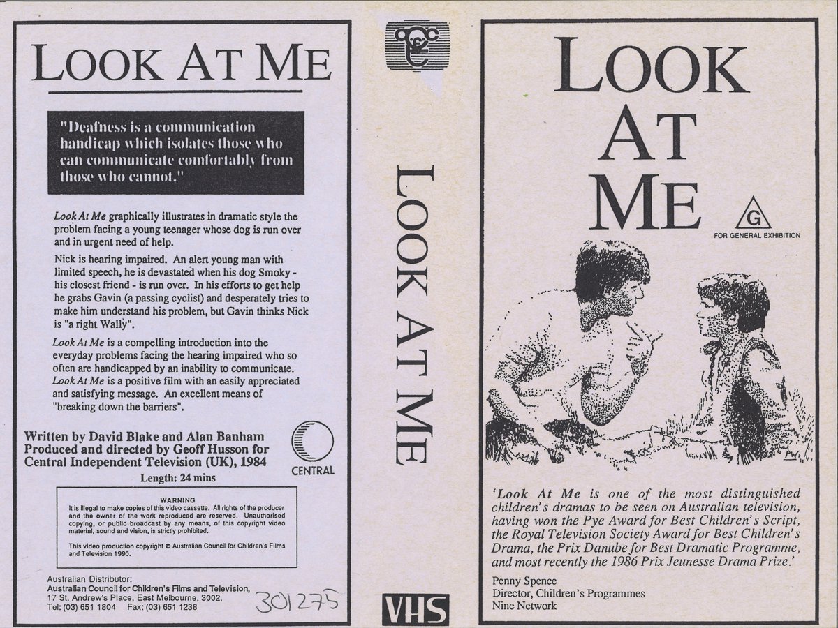 This video graphically illustrates in dramatic style the problem facing a teenager whose dog is run over and in urgent need of help. Nick is hearing impaired. An alert young man with limited speech, he is devastated when his dog, Smoky, his closest friend, is run over. In his efforts to get help he grabs Gavin, a passing cyclist, and desperately tries to make him understand his problem; but Gavin thinks Nick is a “right Wally”. “Look at Me” is a compelling introduction into the everyday problems facing the hearing impaired.