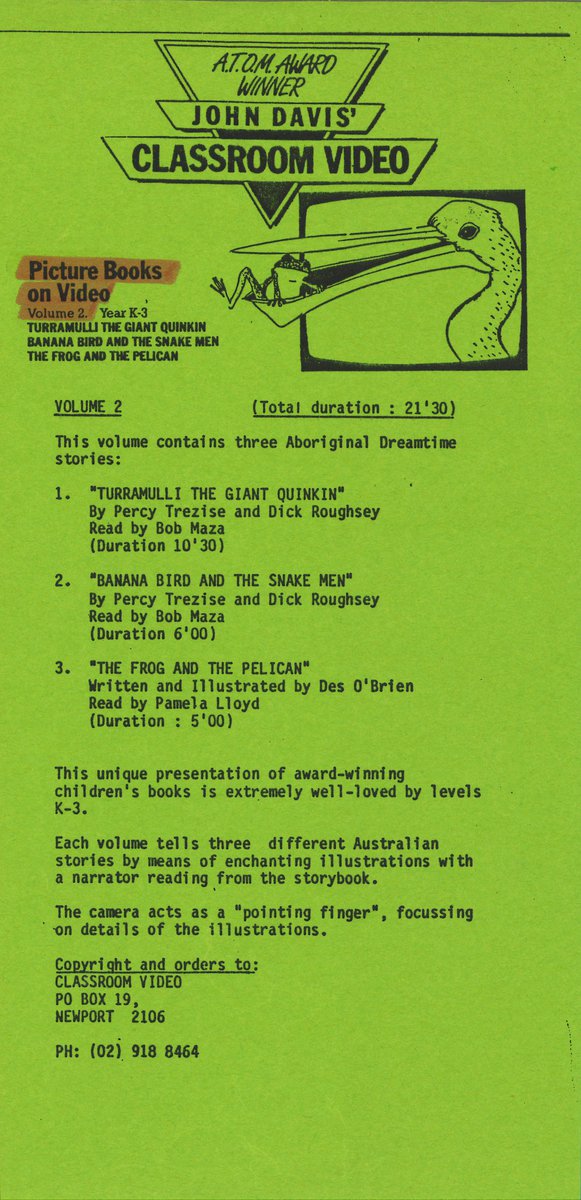 Three Aboriginal Dreamtime stories. “Turramulli the giant Quinkin” and “Banana Bird and the Snake men” are both written by Percy Trezise, illustrated by Dick Roughsey and narrated by Bob Maza. “The Frog and the pelican” is written by Des O’Brien. The stories are narrated with background music as the illustrations are shown on screen.