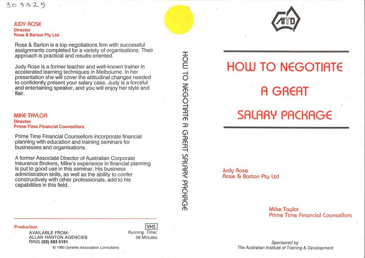 What this video lacks in glamorous production values, it more than makes up for in practical tips to negotiate the salary package you want from your employer. The program is in two segments, the first presented by Judy Rose who is experienced in negotiation skills. The second segment is presented by Mike Taylor of Prime Time Financial Counsellors who gives sound financial advice on options within salary packages. Produced for the Australian Institute of Training and Development.