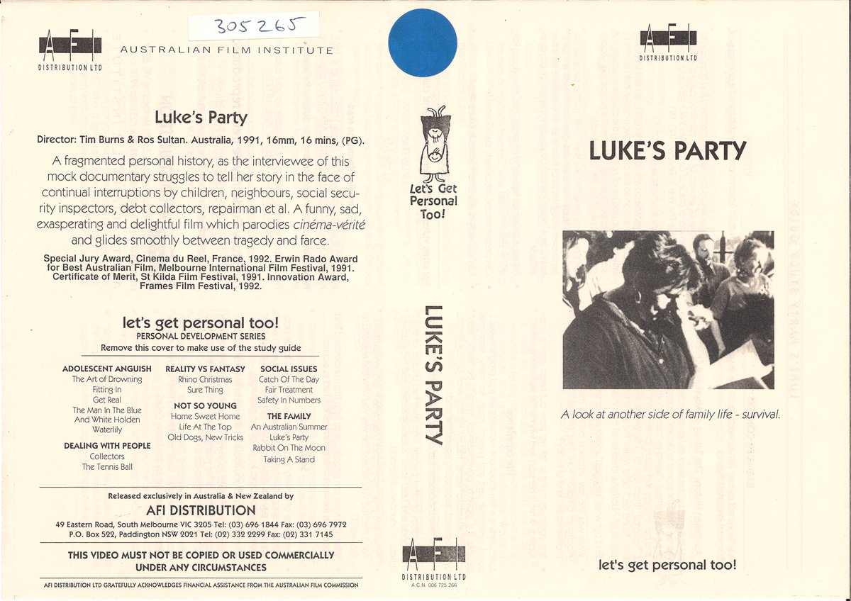 A woman picks up a video camera to make a mock documentary about growing up as a First Nations person in South Australia. As the camera starts rolling she is continually interrupted by the demands of children, friends, telephone repair people, neighbours, salespeople and representatives of a range of government bureaucracies. This delightfully tongue-in-cheek short film makes salient points about the difficulties of maintaining personal dignity in a world of economic and emotional uncertainty. The futility of her attempt to explain “herself” on camera as the world around her descends into absurd farce satirises the pretend objectivity of most social-realist documentary. Sharp, witty and surprisingly passionate, “Luke’s Party” is an exceptional short Australian film.