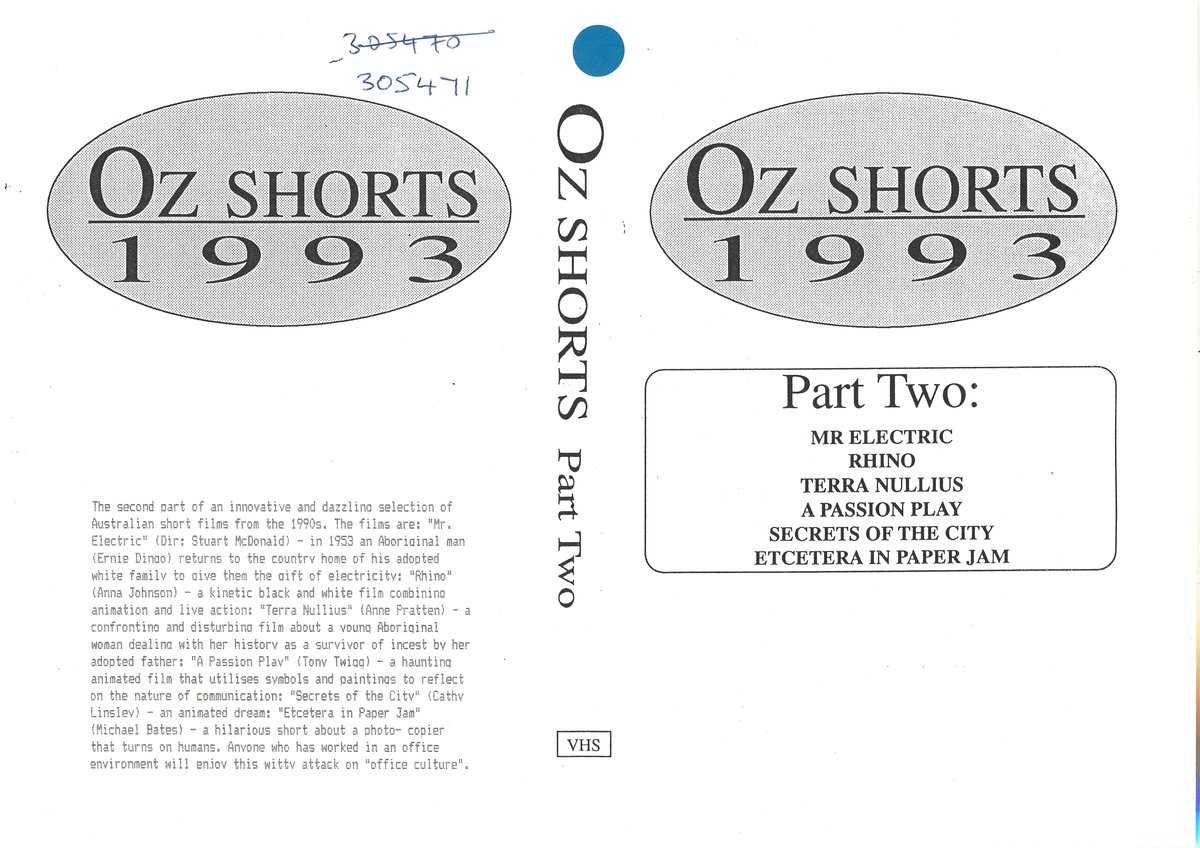 The second part of an innovative and dazzling selection of Australian short films from the 1990s. The films are: “Mr. Electric” (Dir: Stuart McDonald) - in 1953 an Aboriginal man (Ernie Dingo) returns to the country home of his adopted white family to give them the gift of electricity; “Rhino” (Anna Johnson) - a kinetic black and white film combining animation and live action; “Terra Nullius” (Anne Pratten) - a confronting and disturbing film about a young Aboriginal woman dealing with her history as a survivor of incest by her adopted father; “A Passion Play” (Tony Twigg) - a haunting animated film that utilises symbols and paintings to reflect on the nature of communication; “Secrets of the City” (Cathy Linsley) - an animated dream; “Etcetera in Paper Jam” (Michael Bates) - a hilarious short about a photo- copier that turns on humans. Anyone who has worked in an office environment will enjoy this witty attack on “office culture”.