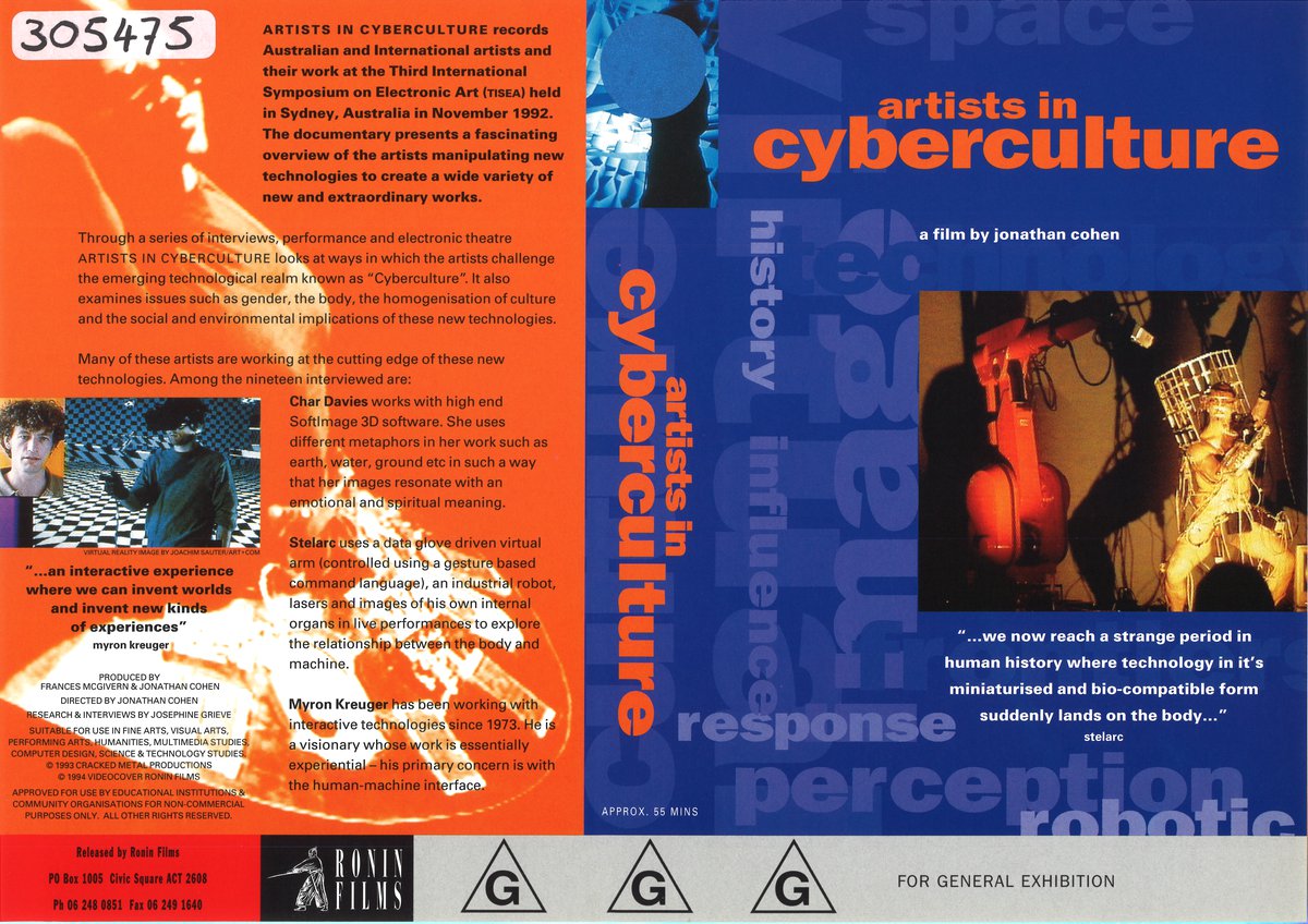 Artists record their work at the Third International Symposium on Electronic Art, Sydney, 1992. Through a series of interviews, performance, electronic theatre, this video looks at ways in which artists challenge the emerging technological realm known as “cyberculture”. It also examines issues such as gender, the body, the homogenisation of culture and the social and environmental implications of new technologies. Three of the artists interviewed are Char Davies, Stelarc and Myron Kreuger.