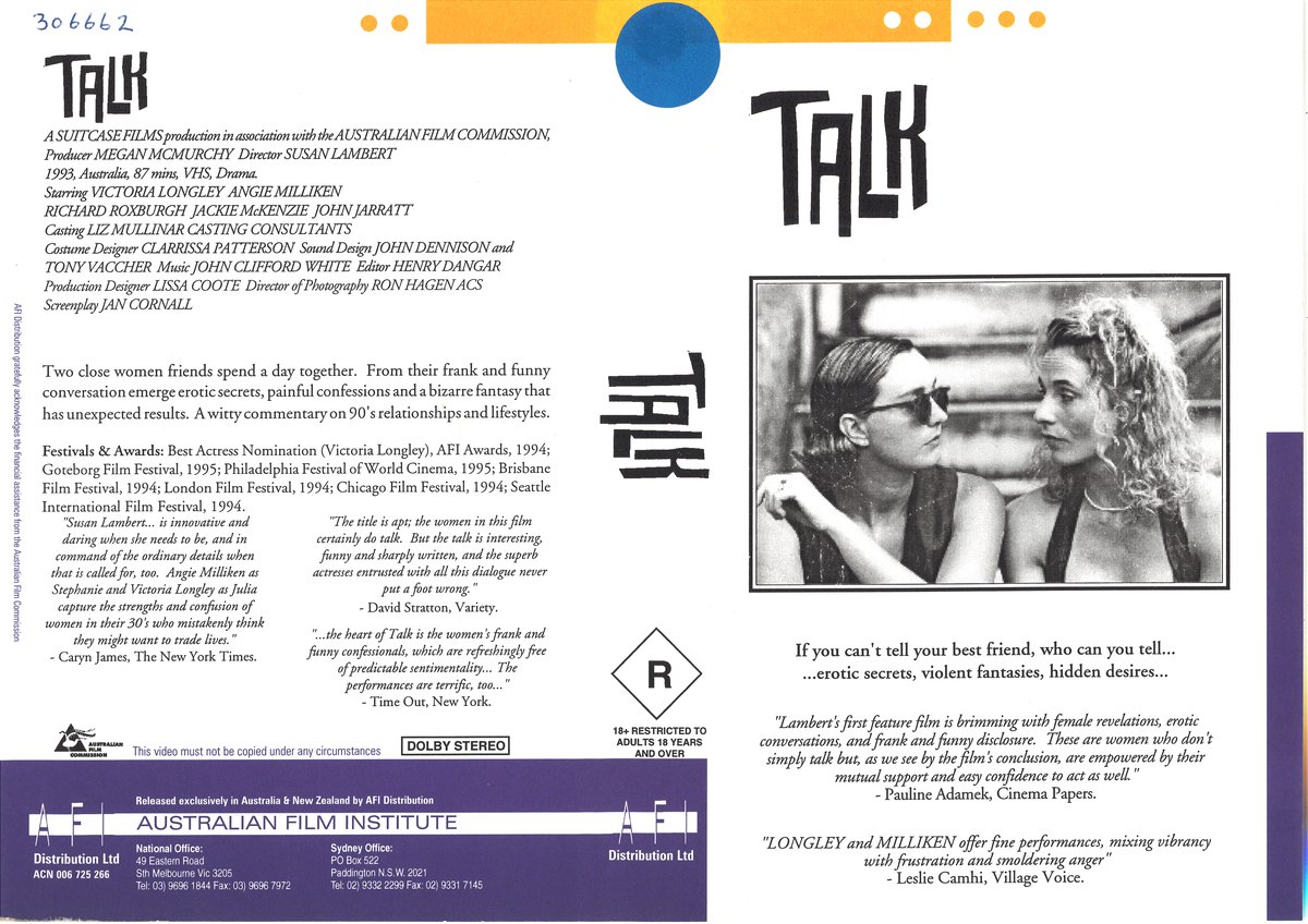 Susan Lambert’s first feature film is a witty commentary on 90’s relationships and lifestyles. Two close women friends spend a day together. Their frank and funny conversations reveal hidden desires, erotic secrets, painful confessions and a bizarre fantasy that has unexpected results. Angie Milliken as Stephanie and Victoria Longley as Julia capture the strengths and confusion of women in their 30’s who mistakenly think they might want to trade lives. These women do not simply talk but, by the film’s conclusion, are empowered by their mutual support and easy confidence to act as well. Co-starring Richard Roxburgh, Jacqueline McKenzie and John Jarratt.