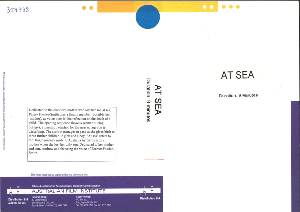 Dedicated to the director’s mother who lost her son at sea, Penny Fowler-Smith uses a family member (possibly her mother), as voice over in this reflection on the death of a child. The opening sequence shows a woman slicing oranges, a painful metaphor for the miscarriage she is describing. The sorrow manages to pass as she gives birth to three further children; 2 girls and a boy. “At sea” refers to the tragic journey made to Australia by the director’s mother when she lost her only son. Dedicated to her mother and son, Andrew and featuring the voice of Bremer Fowler-Smith.