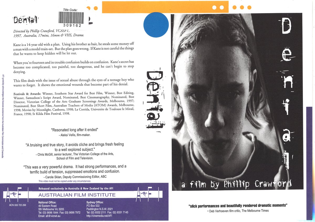 Kane is a 14-year old with a plan. Using his brother as bait, he steals some money off a man with a model train-set. But the plan goes wrong. If Kane is not careful the things that he wants to keep hidden will be let out. This film deals with the issue of sexual abuse through the eyes of a teenage boy who wants to forget. A very real and powerful portrayl of human nature. (Awards: Winner of the Southern Star Award for Best Film, Winner ATOM Awards 1998 Best Tertiary Short Fiction)