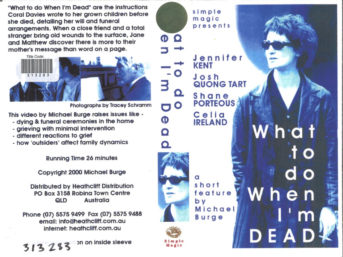 Beginning from the initial reactions of doubt and confusion, then moving on to remembrance, this short program follows the experiences of a brother and sister as they deal with the death of their mother who leaves them the document - “what to do when I’m dead”. The proceedings of the final day are followed as family and friends gather from near and far to share their pain. The video explores issues such as dying and funeral ceremonies at home, grieving with minimal intervention, different reactions to grief and how ‘outsiders’ affect family dynamics. Cast includes Jennifer Kent, Josh Quong Tart, Shane Porteous and Celia Ireland.