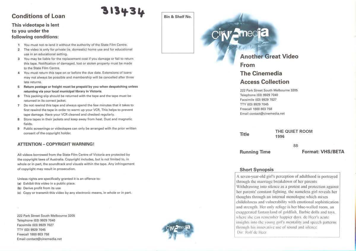 A seven-year-old girl’s perception of adulthood is portrayed through the marriage breakdown of her parents. Withdrawing into silence as a protest and protection against her parents’ constant fighting, the nameless girl reveals her thoughts through an internal monologue which mixes childishness and vulnerability with emotional sophistication and strength. Her only refuge is her blue-walled room, an exaggerated fantasyland of goldfish, Barbie dolls and toys, where she can remember happier days. de Heer’s acute insights into the young girl’s mentality and speech patterns through his innovative use of sound and silence is combined with a highly stylised mise-en-scene, to convey the hermetic insularity of her childhood world. Like ‘Bad Boy Bubby’, ‘The Quiet Room’ explores the dysfunctional behaviour of parents and the lasting effect it has on their children. Cast includes: Celine O’Leary, Paul Blackwell, Chole Ferguson and Phoebe Ferguson.