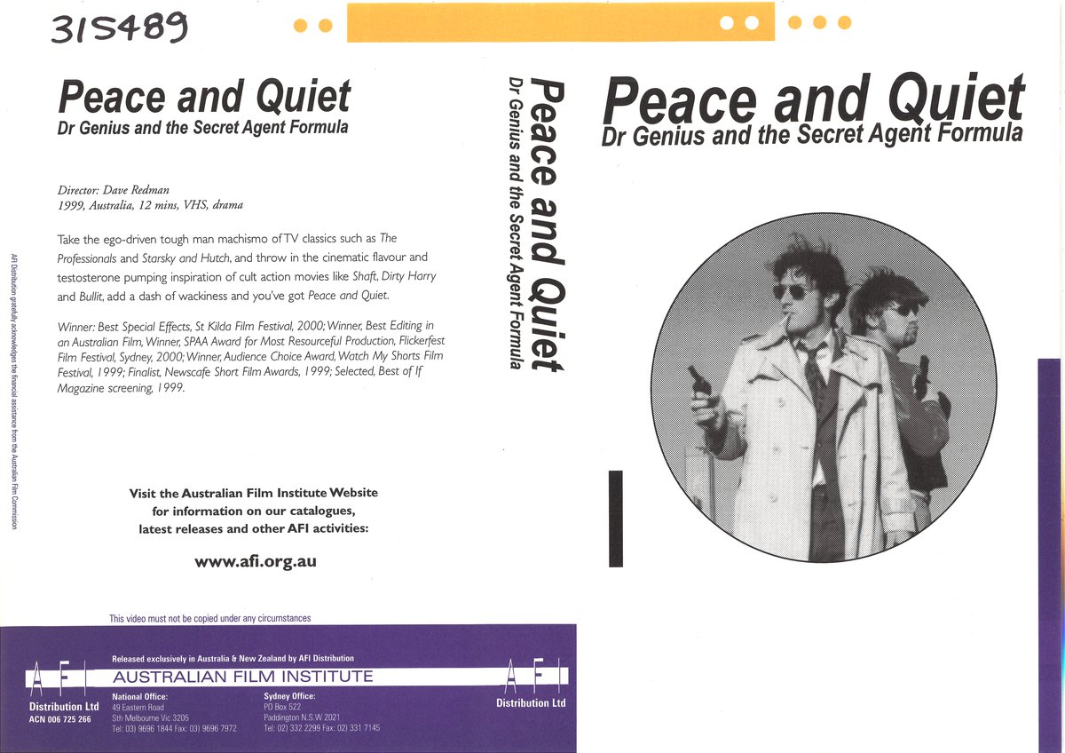 When the formula to create a super secret agent is stolen from Dr. Genius, it’s left up to special agents Julian Pearce and Frank Quiet to get it back. (Awards: Winner of the Best Special Effects, St Kilda film Festival, 2000, Best Editing in an Australian Film) Cast includes Charles Hollywood and Brian Sisko. Written by Daniel Armstrong.