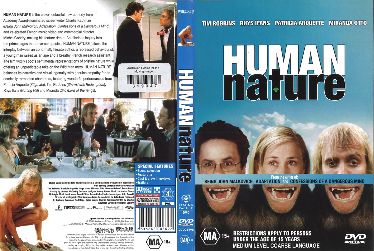 Feature film debut for video filmmaker Michel Gondry and follow-up for writer Charlie Kaufman of “Being John Malkovich” fame. A quirky love triangle about dysfunctional people all wanting acceptance, or is it just sex they are after? Lila (Patricia Arquette) is covered in body hair and loves the solitary life of the wild-outdoors but her sexual needs take her to the city. After some intensive hair removal by an electrolysis expert (Rosie Perez), Lila finds love with scientist Nathan (Tim Robbins) who experiments on mice, teaching them table manners. Together they find a wild man (Rhys Ifans) who was raised by apes, whom Nathan and his lusty French assistant (Miranda Otto) name “Puff”. After Nathan’s taming and re-training of Puff, Lila wants to free Puff from the laboratory allowing him return to his true nature.