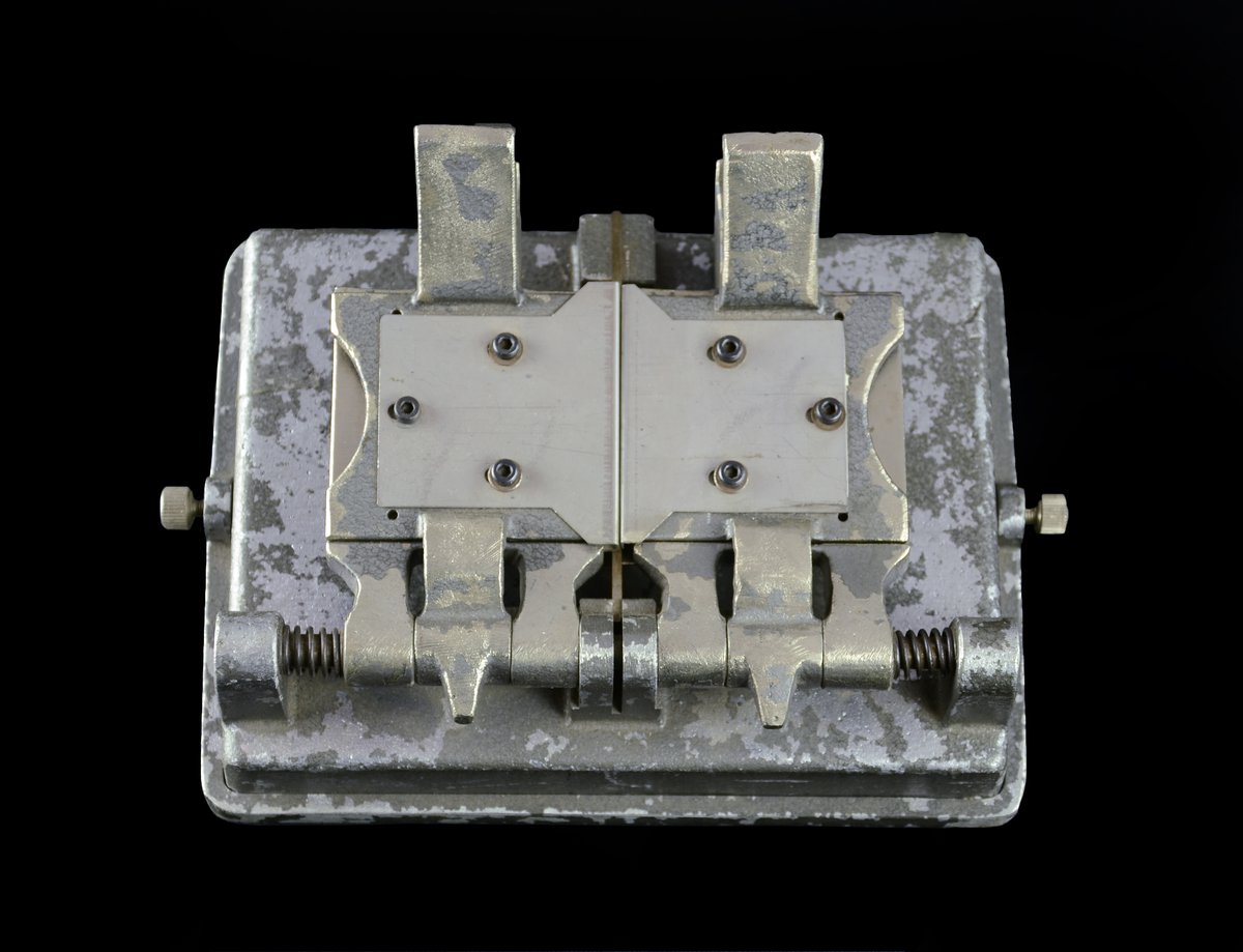 A film splicer is an essential tool for film editing, enabling the physical joining of film strips. This splicer is designed for cement joins on 70mm film, the largest standard motion picture format. Splicing with cement requires the removal of photographic emulsion from the film end, application of film cement (a solvent-based adhesive) and precise alignment when fusing the two film segments. Cement splices create a strong join along the frame edge and is usually not visible when film is projected.