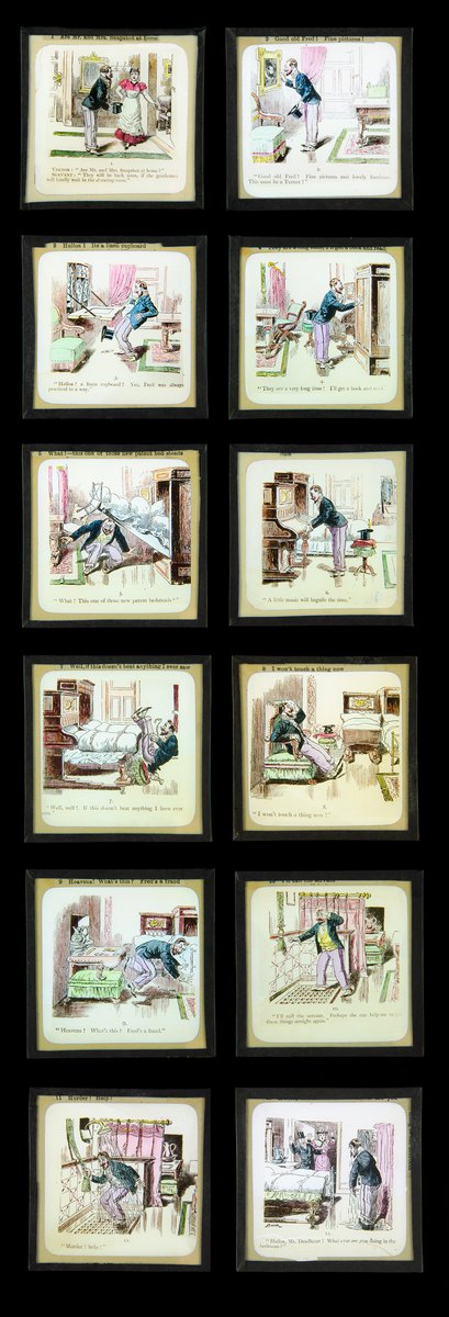 Twelve glass slides: Mr & Mrs Snapshot, ‘The Humourous Side of Modern Appliances’. G.M. Mason, Southampton, England, c. 1879-1917