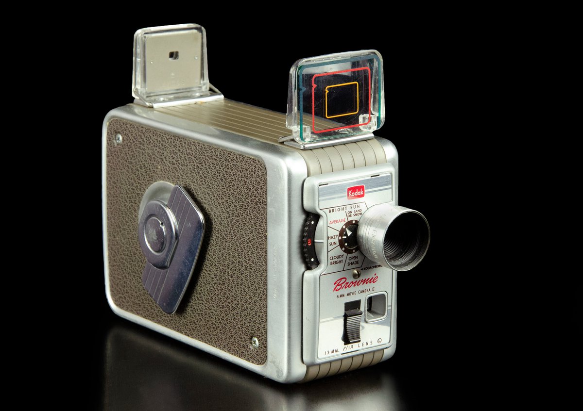 A new and improved model of the popular 8mm. Brownie Movie Camera. This inexpensive movie camera provides all the fun of making sparkling 8mm. full-colour home movies with the simplicity of taking black- and white snapshots. All the user has to do is load, set the lens aperture pointer (according to the lighting conditions bright, dull, etc.), and press the button. A fast Lumenized 13mm. Cine Ektanon f/1.9 lens ensures bright sharp pictures. Sprocketless loading makes film threading easy and straightforward film is simply slipped into the gate and onto the take-up reel. Other features are: Long-running spring-driven motor; two-position exposure release; collapsible plastic viewfinder with parallax correction; easily read footage indicator; fingertip click stop aperture control; and handy tripod thread. Of aluminium construction, it is complete with a solid hide, velvet lined compartment case. Loads with doublerun Kodachrome Movie Film.