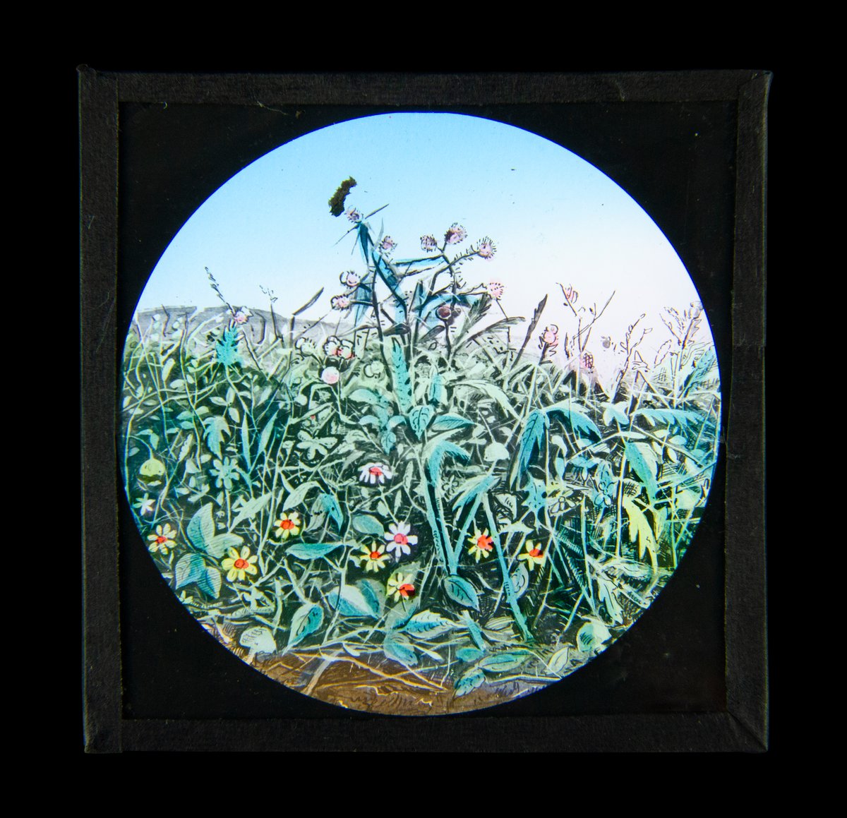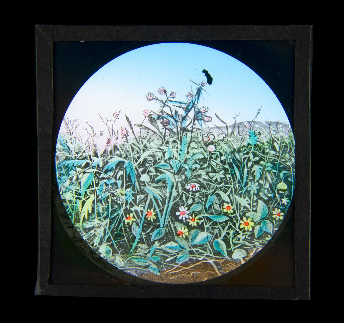 Colour magic lantern slide depicting flowers in a meadow.