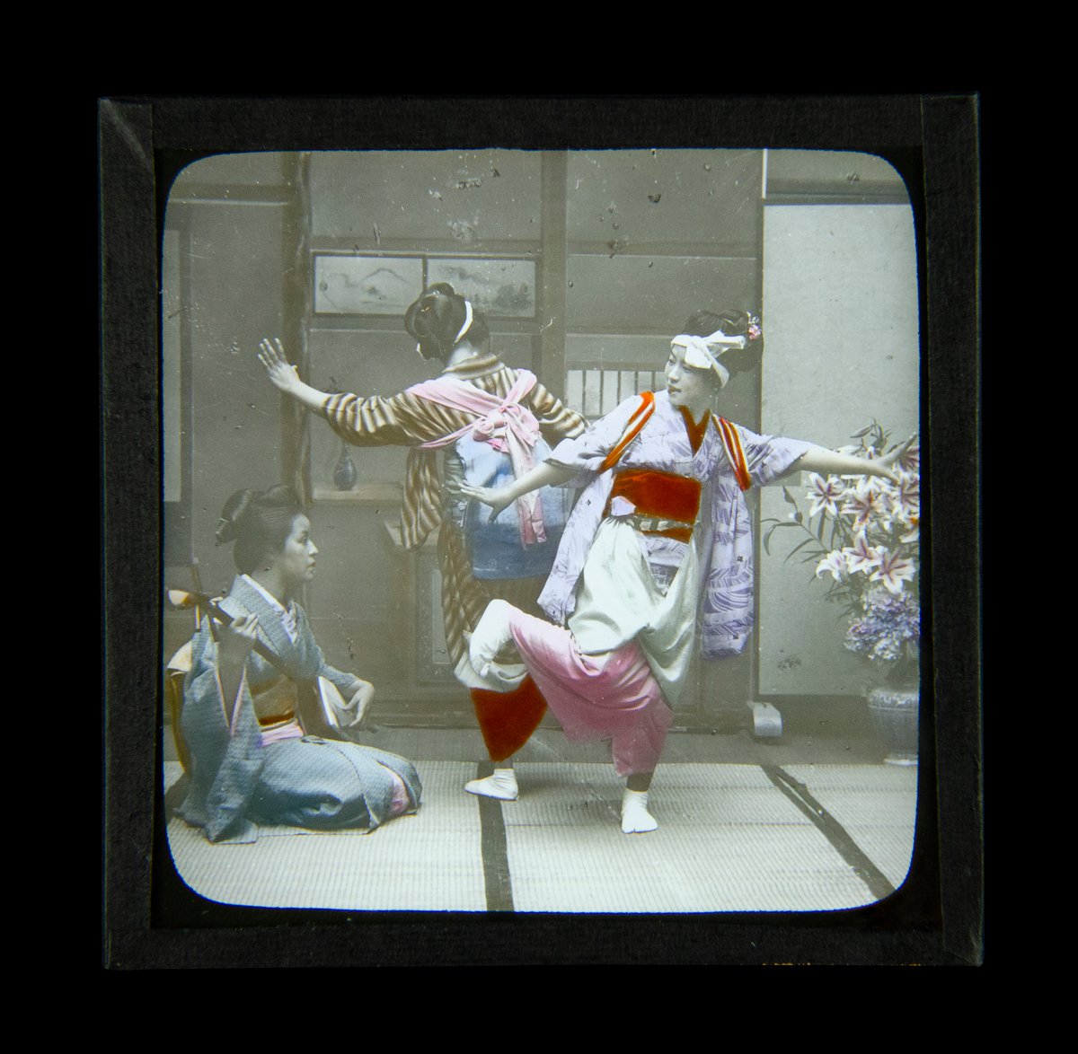 Colour magic lantern slide depicting Girls Dancing and Musician, Japan