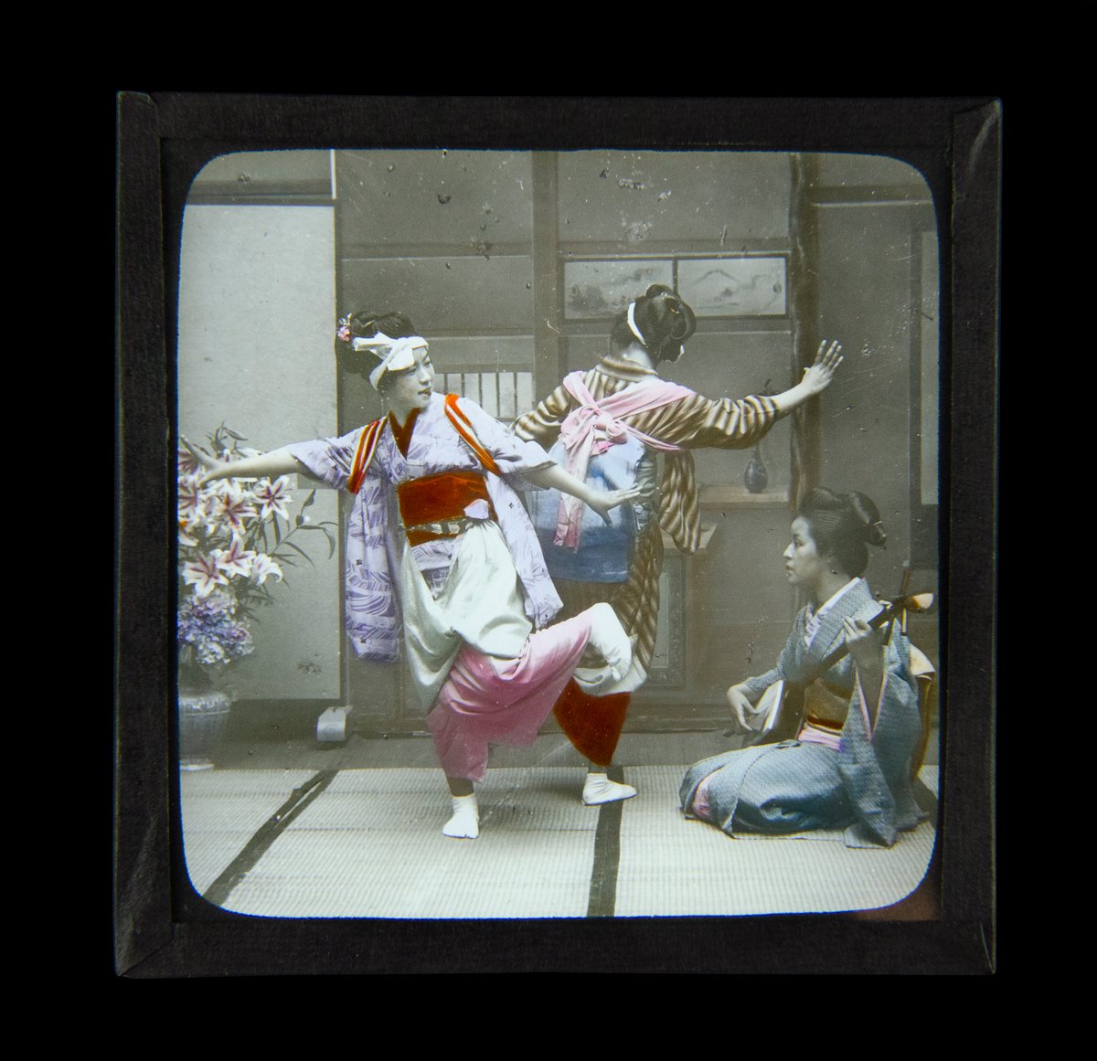 Colour magic lantern slide depicting Girls Dancing and Musician, Japan